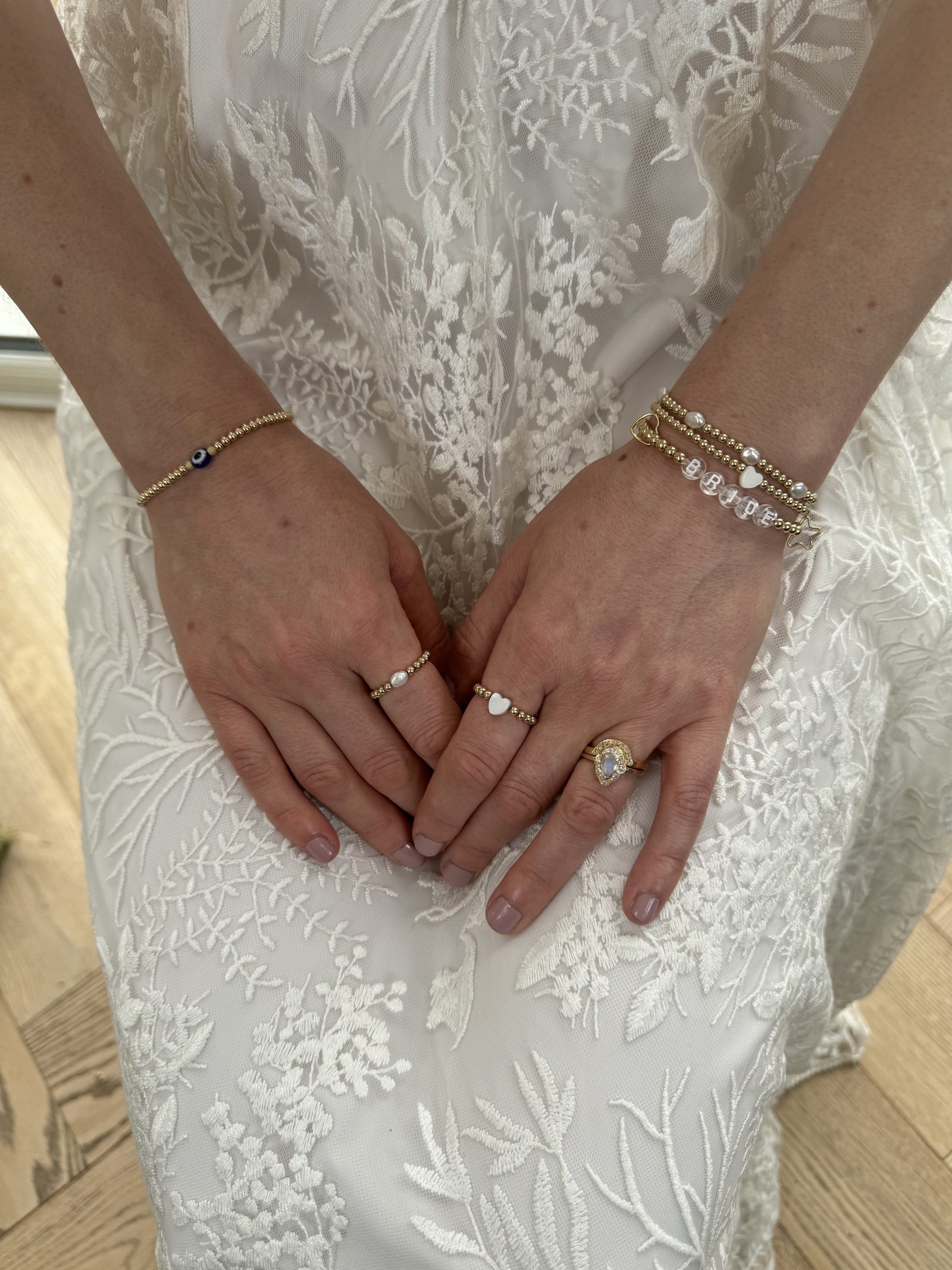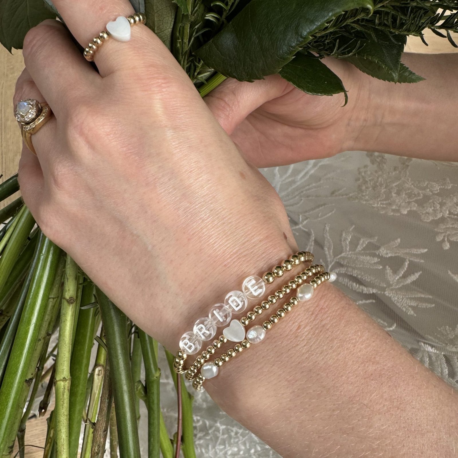 The most sophisticated and effortless style for her special day with clear letter beads luxe, handmade, customised name bracelet available in 14ct gold filled, rose gold filled and sterling silver beads.
