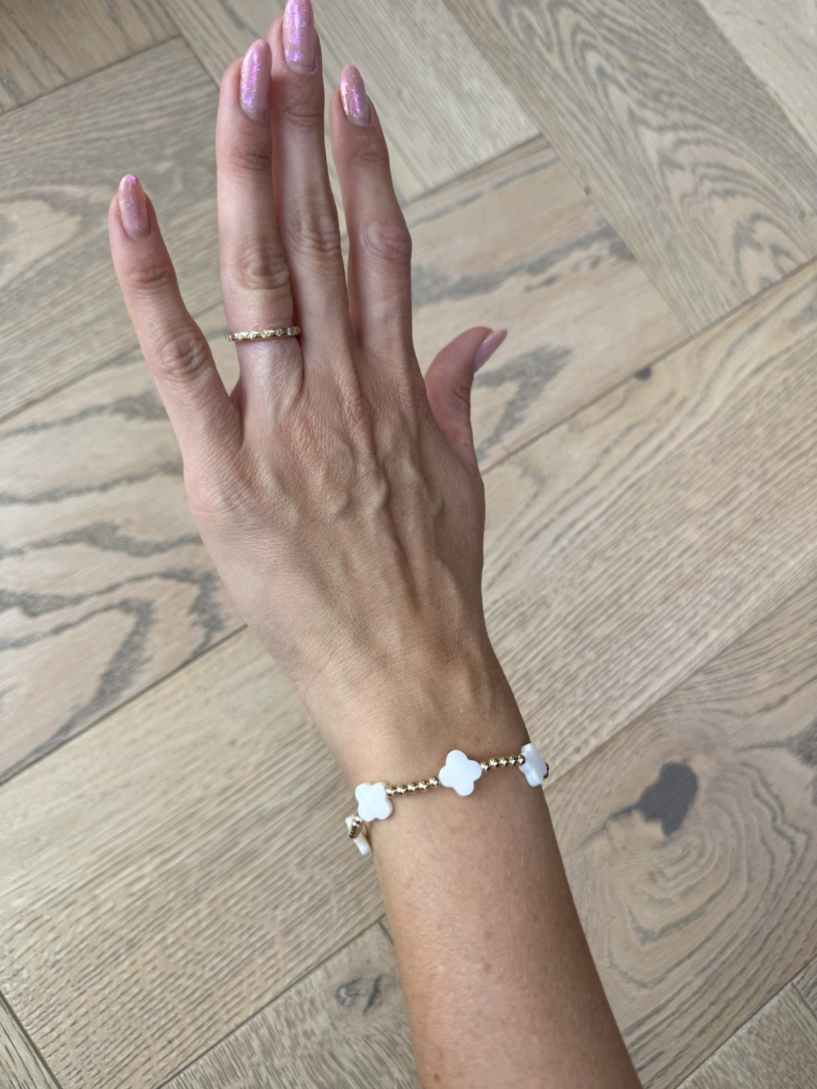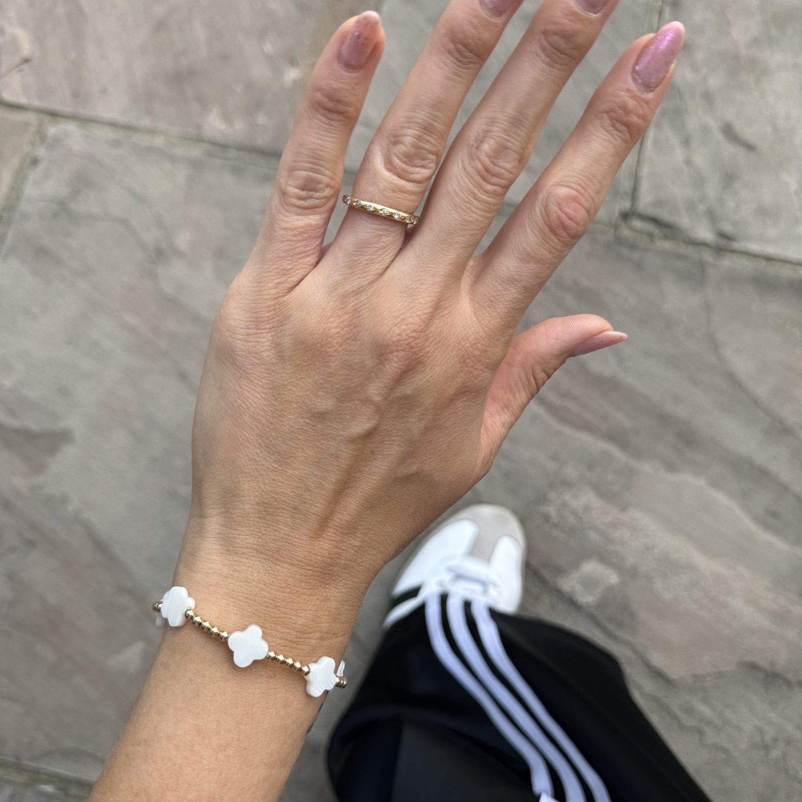 This style comes with five mother-of-pearl clover beads (standard size- other sizes will vary) and is a bracelet that comprises a thick layer of 14ct gold over a solid brass core. It is delicate as the bead hole is smaller, therefore the elastic width must be thinner than what we use on our standard glass bracelets. This bracelet comes with a 5mm bead at the tie.