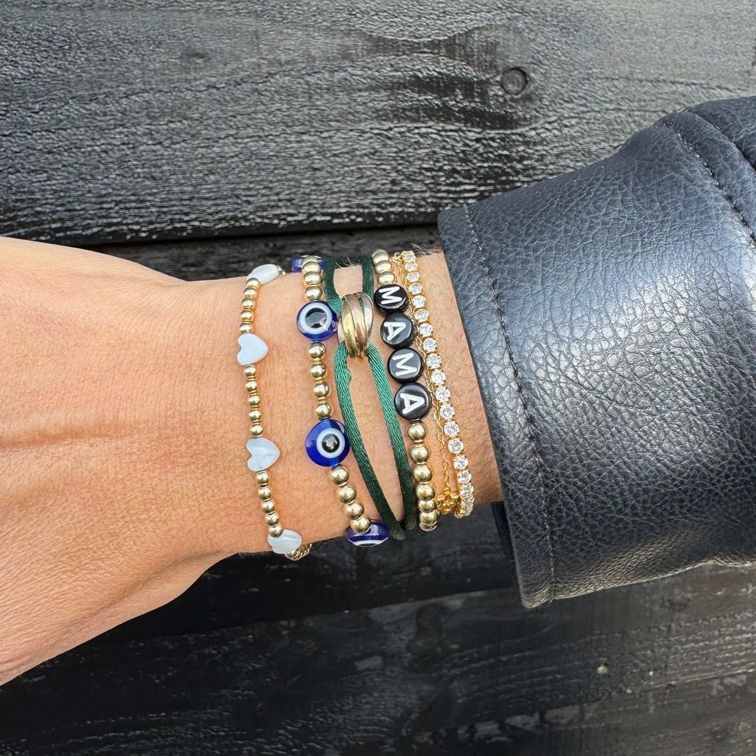 This style comes with five mother-of-pearl heart beads (standard size- other sizes will vary), and the bracelet comprises a thick layer of 14ct gold over a solid brass core. It is delicate as the bead hole is smaller; therefore, the elastic width must be thinner than what we use on our standard glass bracelets. This bracelet comes with a 5mm bead at the tie.