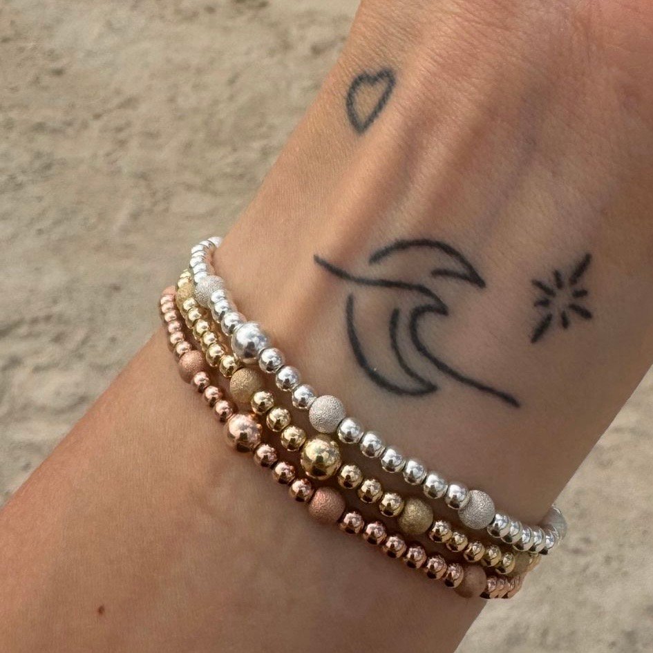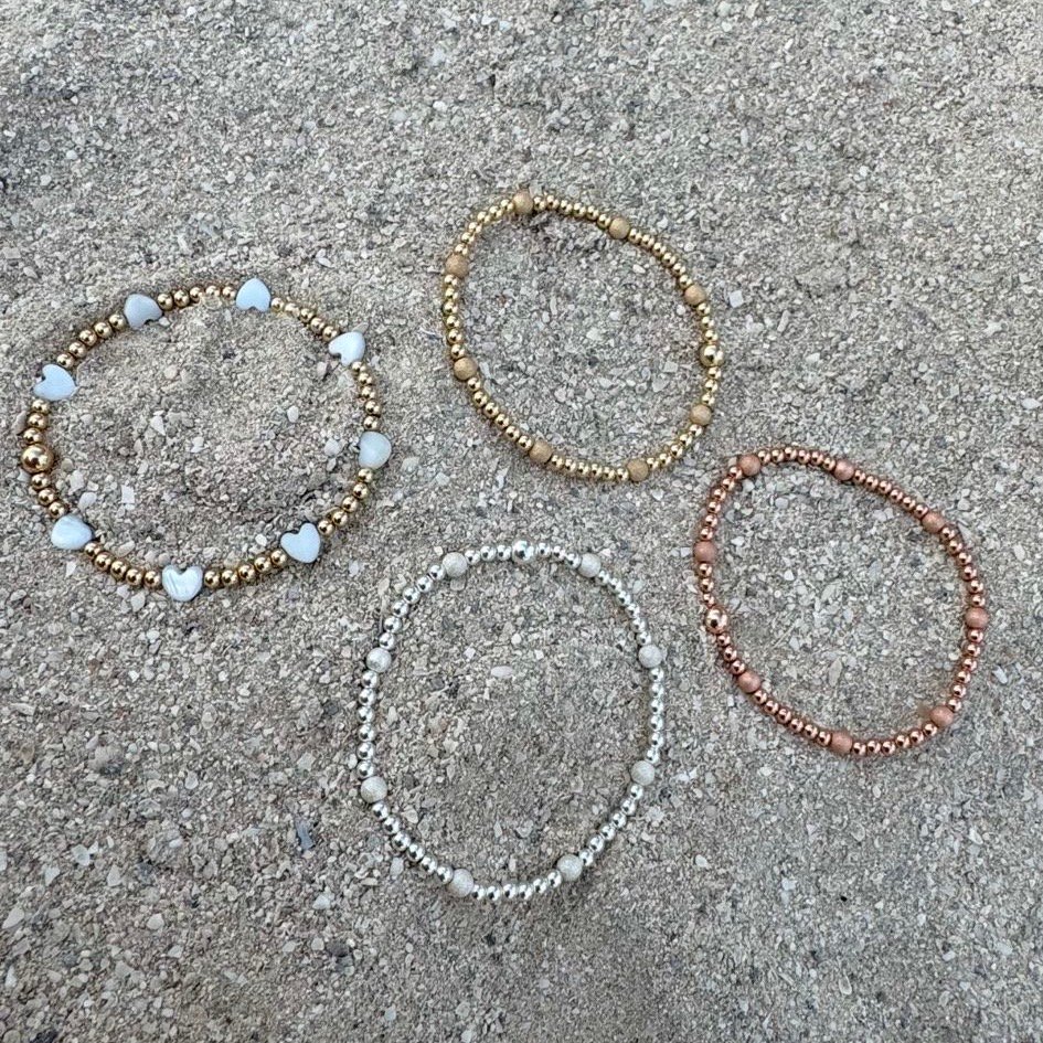 Gold-filled and Sterling Silver beads are much more expensive than gold plated beads however the life span is less than solid gold metals. These bracelets can be worn all of the time.