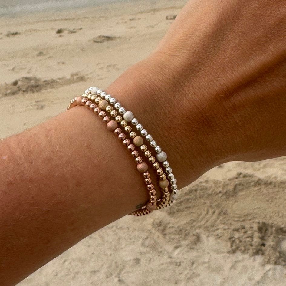 Our brand new bracelet features 3mm gold-filled beads with scattered sparkle stardust beads with a 5mm bead at the tie. Each bracelet is available in either 14ct gold-filled, rose gold-filled, or sterling silver beads.