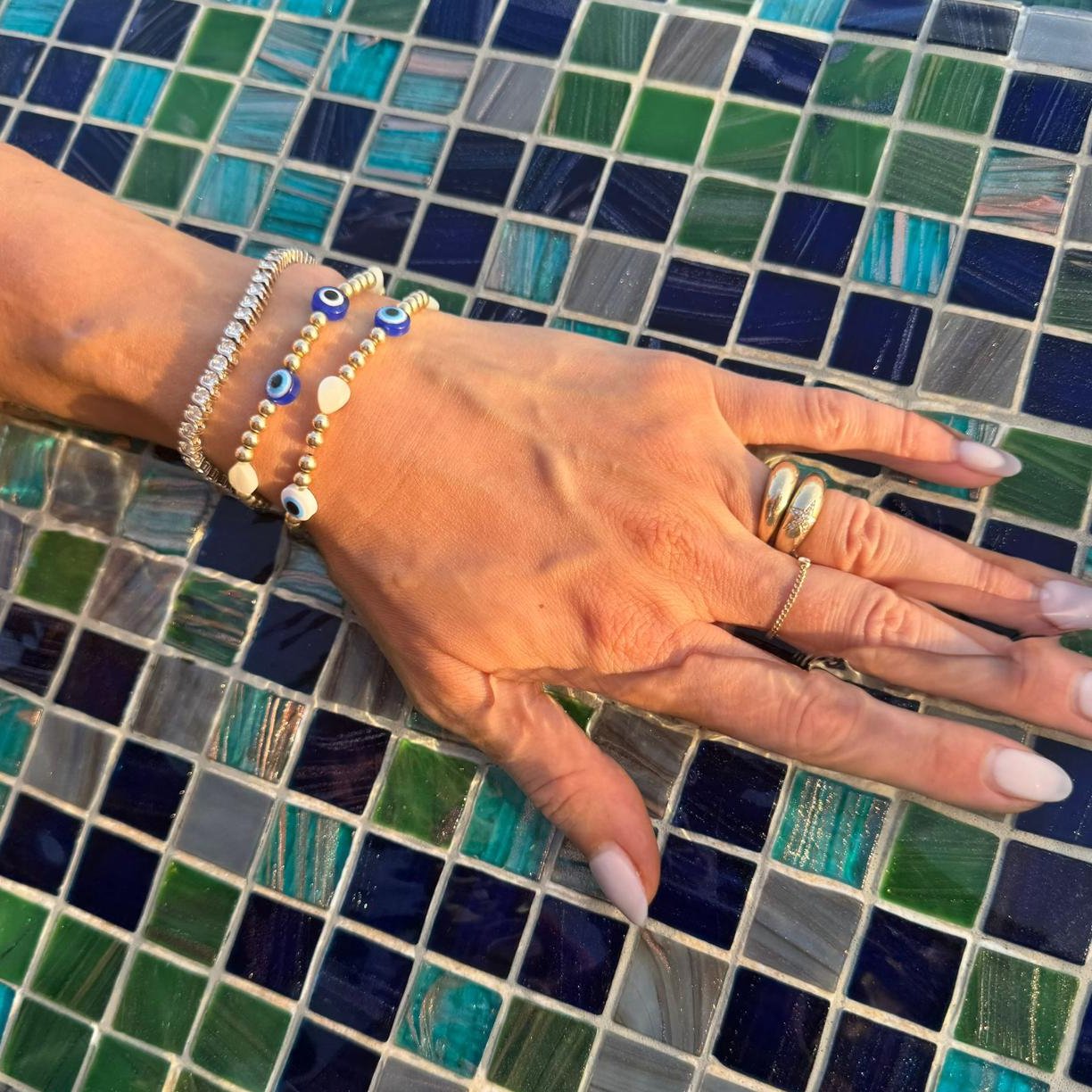 This style comes with blue, double blue, and white eye beads and mother-of-pearl drops. The bracelet comprises a thick layer of 14ct gold over a solid brass core or sterling silver beads. It is delicate as the bead hole is smaller, therefore the elastic width must be thinner than what we use on our standard glass bracelets. This bracelet comes with a 5mm bead at the tie.